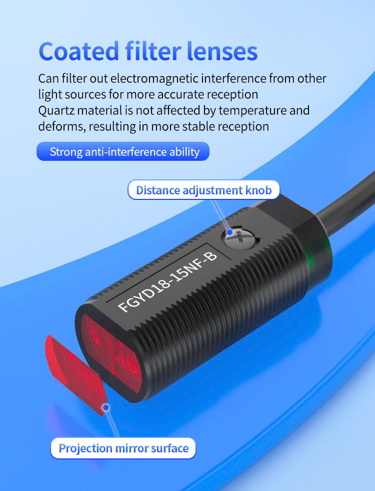 Sensorns front-end har en belagd filterlins som effektivt filtrerar stray ljus och elektromagnetisk störning från miljön, vilket säkerställer korrekt och stabil signalmottagning. Tillverkad från kvartsmaterial motstår linsen höga temperaturer och deformation och bibehåller enastående prestanda även i miljöer med betydande temperaturfluktuationer. Denna design förbättrar ytterligare tillförlitligheten för vårmaskindetekteringssensorer under hårda driftsförhållanden.
