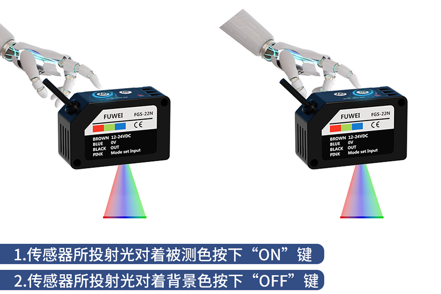Högprecisionsfärgläge: Växla till detta läge när du behöver extremt fin differentiering av färgskillnader. FGS-22 lyser samtidigt R (röd), G (grön) och B (blå) primärfärgs-LED. Den identifierar färger genom att analysera det exakta förhållandet mellan RGB-toner i det reflekterade ljuset från objektet. Denna avancerade färgsensorteknologi övervinner effektivt omgivande ljusstörningar och ytstruktursvariationer och uppnår mycket tillförlitlig identifiering av komplexa färger. Den är idealisk för applikationer med hög precision som gradering av produktkvalitet och inspektion av färgskillnader.