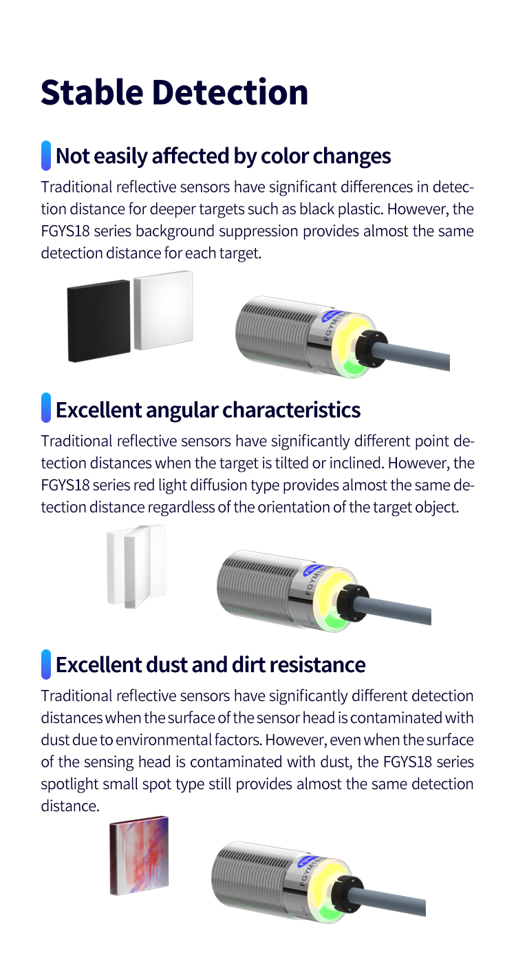 Traditionella sensorer misslyckas ofta med att upptäcka föremål på grund av färg- eller materialvariationer. FGY18-10NU-B använder avancerad optisk design för att uppnå stabil upptäckt av föremål oavsett färg eller material. Oavsett om detektering av metalldelar, plastarbetsstycken eller mörkfärgade material under CNC-bearbetning, upprätthåller den konsekvent känslighet och säkerställer sömlösa och exakta produktionsprocesser.