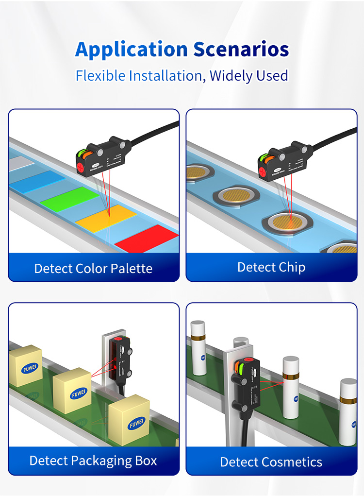 I branscher som tryckning och textilier spelar färgplattdetekteringssensorer en kritisk roll. FGNS08-10-serien upptäcker exakt färgplattor på olika nyanser, som inte påverkas av färgdjup, vilket säkerställer konsekvent produktkvalitet.