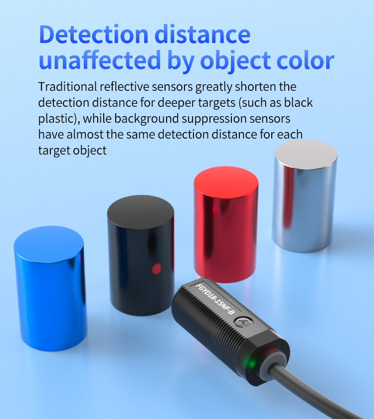 Konventionella reflekterande sensorer är mycket mottagliga för detekteringsavståndsvariationer som påverkas av målfärg och material, särskilt upplever brant avstånd förfall vid detektering av mörka föremål. FGYD18 -serien använder bakgrundssuppressionsteknologi. Genom att använda specialiserade interna optiska komponenter och trianguleringsprinciper får det inte bara reflekterad ljusintensitet. Istället beräknar det ljuspunktens position för att bestämma närvaron av ett objekt. Detta gör att det effektivt kan ignorera bakgrundsstörningar och exakt låsa detekteringsfokuset på ett förinställt avstånd. Följaktligen uppnår den nästan konsekventa detektionsavstånd för svarta, vita eller andra färgade föremål, vilket förbättrar detekteringens tillförlitlighet och konsistens avsevärt.