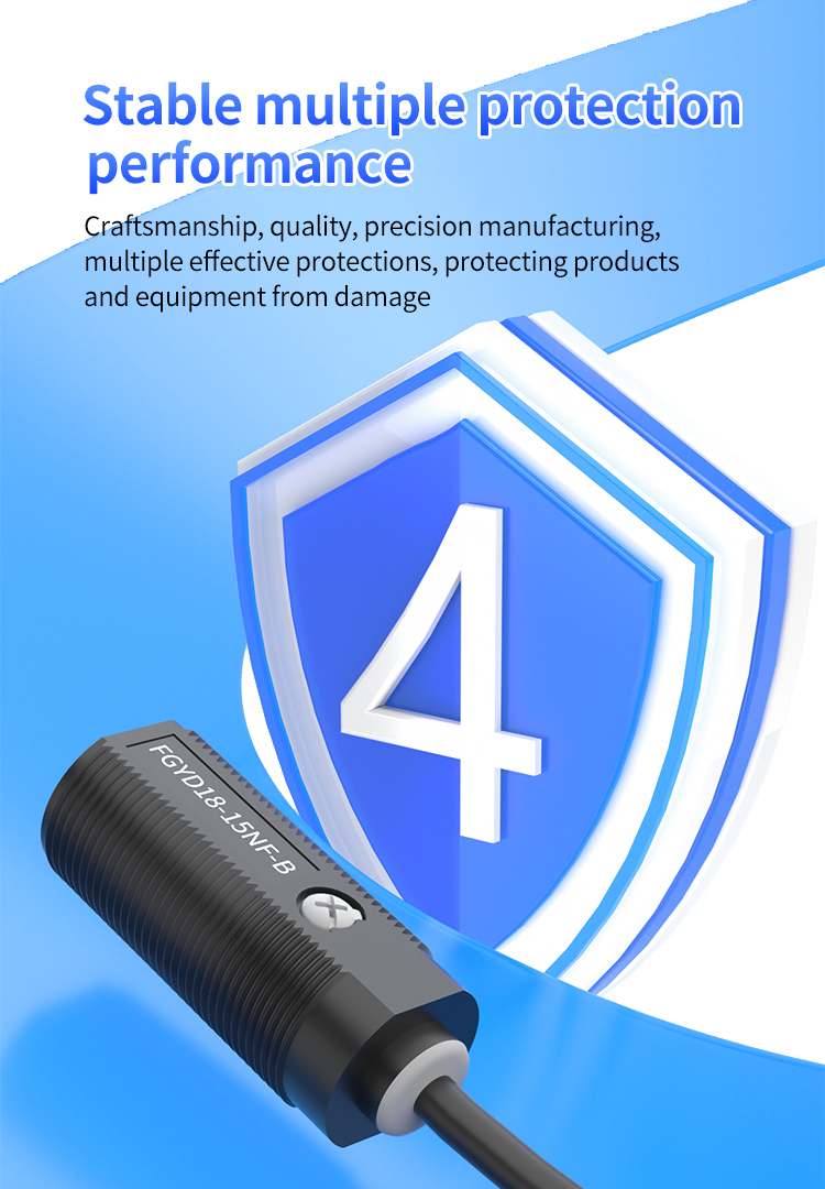 Först innehåller FGYD18 -serien flera skyddsfunktioner för att säkerställa konsekvent prestanda. Denna högprecisionsfotoelektriska sensor är utformad med precisionsteknik och upprätthåller långsiktig tillförlitlighet även i hårda miljöer. Dess kortslutningsskyddsmekanism skyddar både produkten och ansluten utrustning från utbrändhet under belastningsfel eller fel. Överbelastningsskydd avbryter automatiskt strömmen under onormala strömspikar för att förhindra skador. Omvänd polaritetsskydd säkerställer att produkten förblir oskadad även om strömkablarna är felaktigt anslutna. Dessutom möjliggör dess 12-24V breda spänningsdesign långsiktig stabil drift inom DC 12-24V-intervallet, vilket avsevärt förbättrar anpassningsförmågan och tillförlitligheten. För användare som prioriterar hög stabilitet, innebär detta till minskad driftstopp och förbättrad den totala driftseffektiviteten.