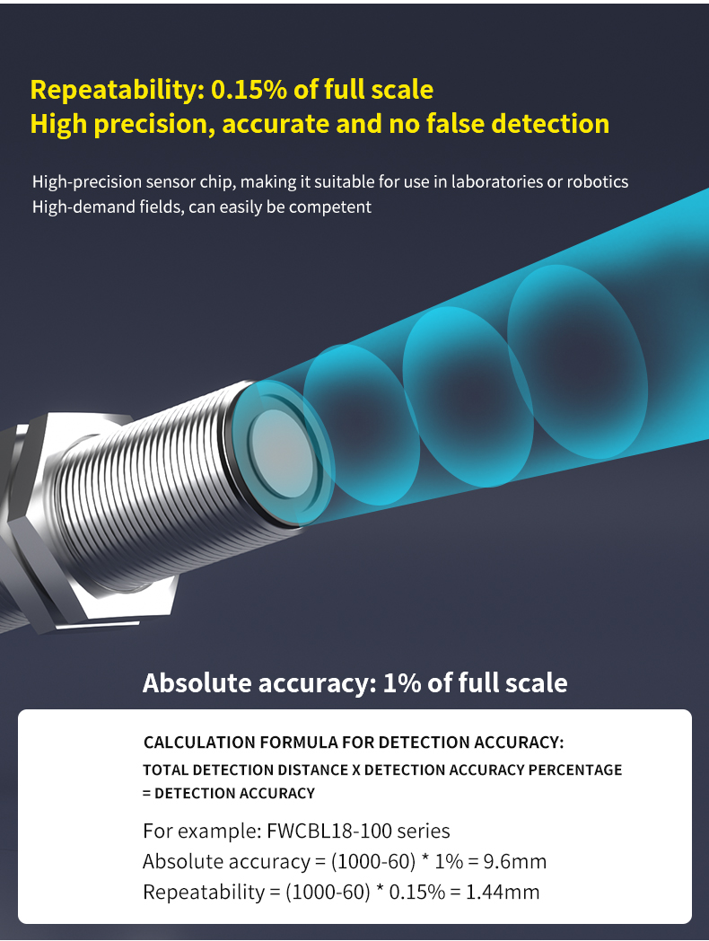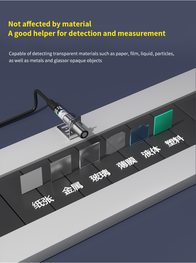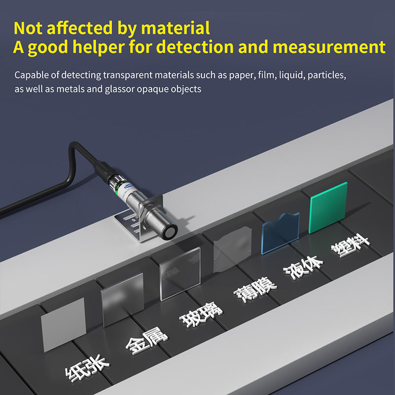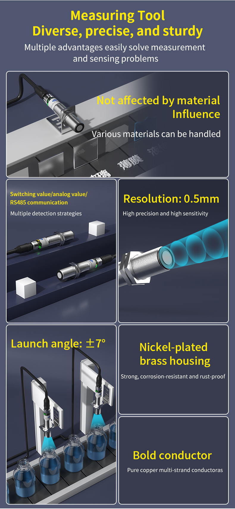 Med hög precision på 0,5 mm upplösning och en smal emissionsvinkel på ±7° säkerställer den extrem mätnoggrannhet och utmärkt motstånd mot störningar. Oavsett målytan – ljusabsorberande, reflekterande eller transparent – ger den stabil prestanda, helt opåverkad av materialet eller färgen på det detekterade föremålet.