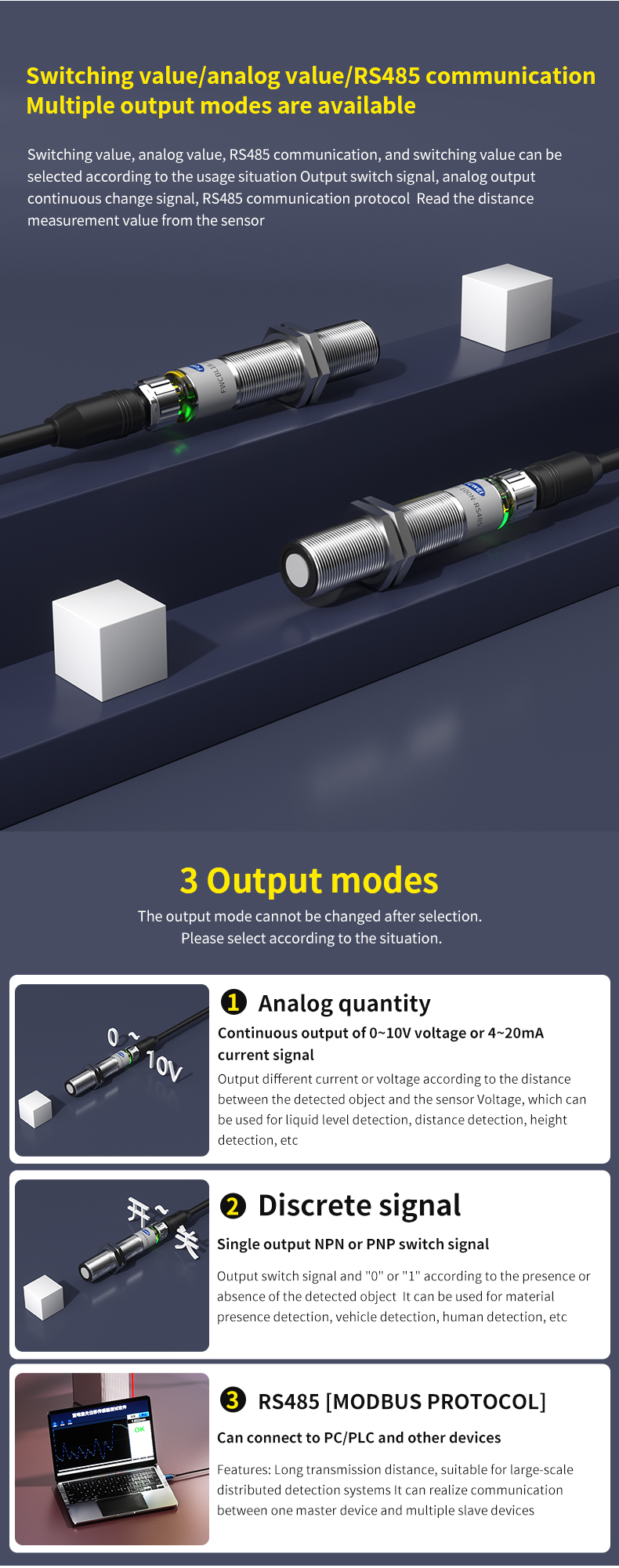 Fuweidian ultraljudsavståndssensor är en högpresterande, industriell kvalitetslösning. Den integrerar tre utgångslägen – analog, switching och RS485-kommunikation – vilket ger exceptionell anslutningsmångsidighet. Med en hög upplösning på 0,5 mm och en smal emissionsvinkel på ±7°, garanterar sensorn exakt mätning och överlägsen anti-interferensförmåga i olika komplexa industriella miljöer. Dess utmärkande fördel ligger i detektering som är helt opåverkad av målobjektets material, ytfärg eller glans, vilket ger en stabil och pålitlig lösning för nivåavkänning, objektdetektering och kontinuerliga avståndstillämpningar. Denna robusta och hållbara sensor är den idealiska avkänningspartnern för att uppnå högeffektiv automation och intelligenta uppgraderingar.