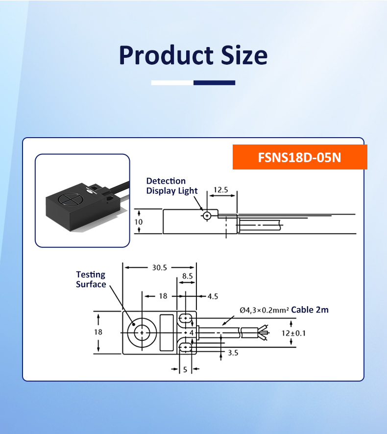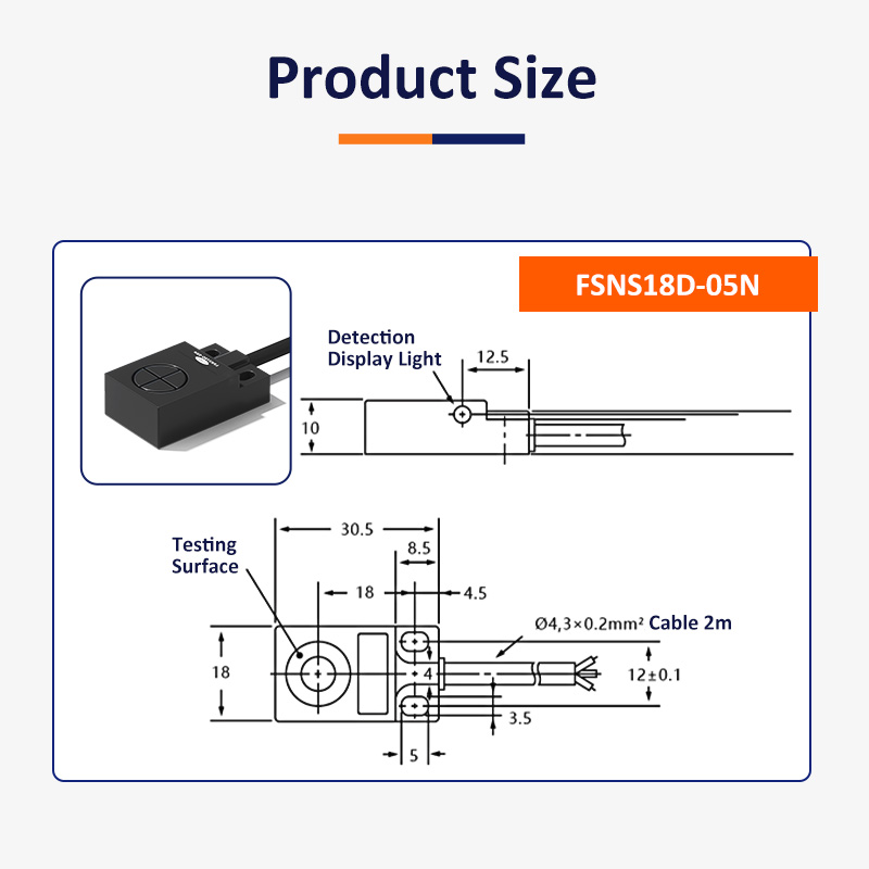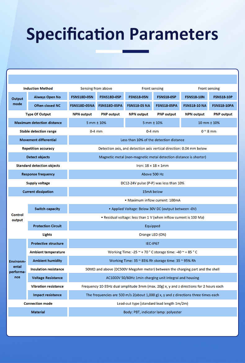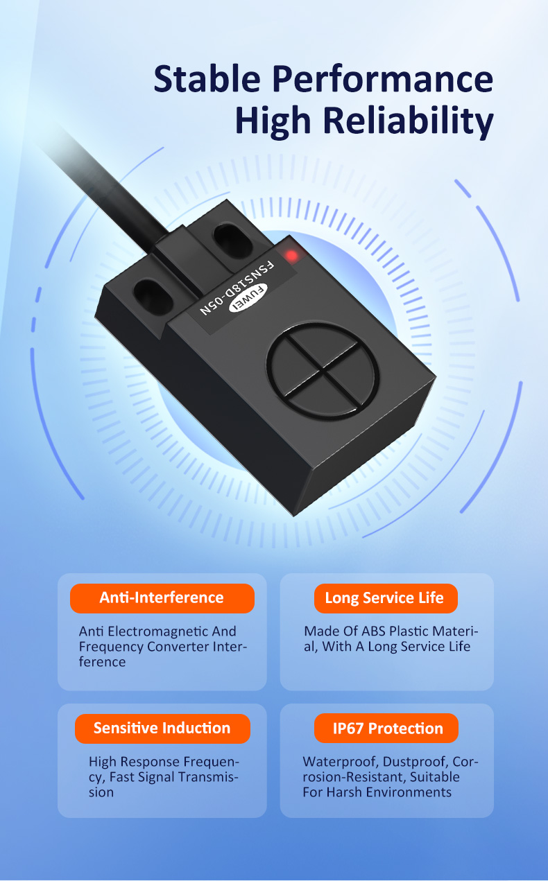 S: Som en induktiv närhetssensor är FSNS18D-05 designad för att detektera järnhaltiga metaller (som järn och stål) och, inom ett reducerat område, icke-järnmetaller (som aluminium och koppar). Den upptäcker inte plast, trä, glas eller vätskor.